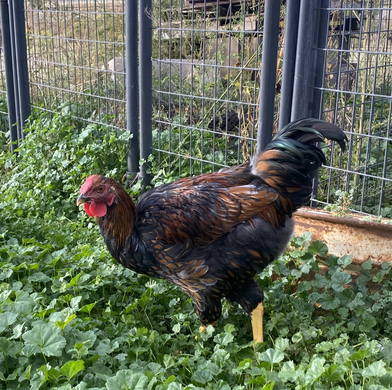 It must just be his bad side because this guy is pretty handsome… This is my new rooster, courtesy of Victoria. Out of her chicks, 3 turned out to be roosters. I haven’t had a rooster for a couple of years, so I’m giving it a try again. The cost of chicks has gone up…