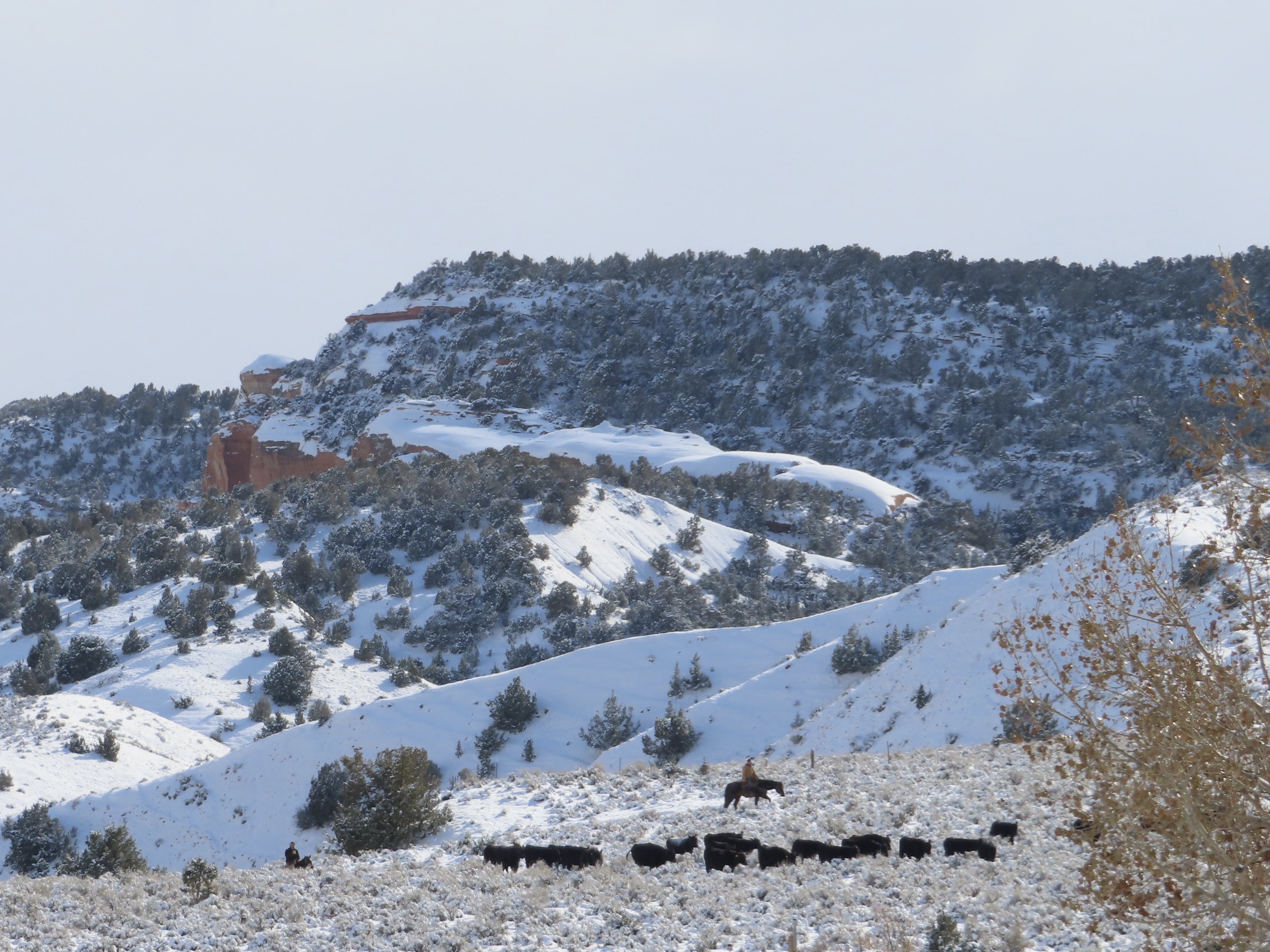 I was focused on the snow, cows & cowboy & almost missed the red rocks- Thanks for another good one! Reply