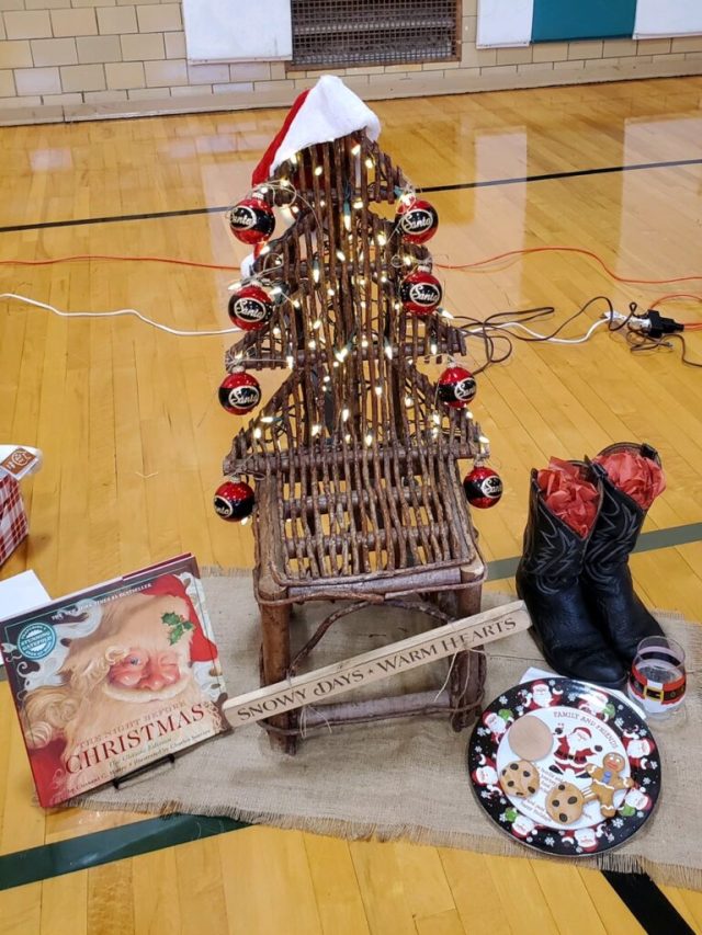 This cute little tree shaped chair boasts white lights on the back, Santa ornaments edge the tree chair, with Santa’s hat and cowboy boots nearby. “Snowy days and warm hearts” is a sign on the front. A plate with clay cookies and an empty glass set to the side. A great Night Before Christmas book accompanies the setting. All rest on a fringed burlap rug.