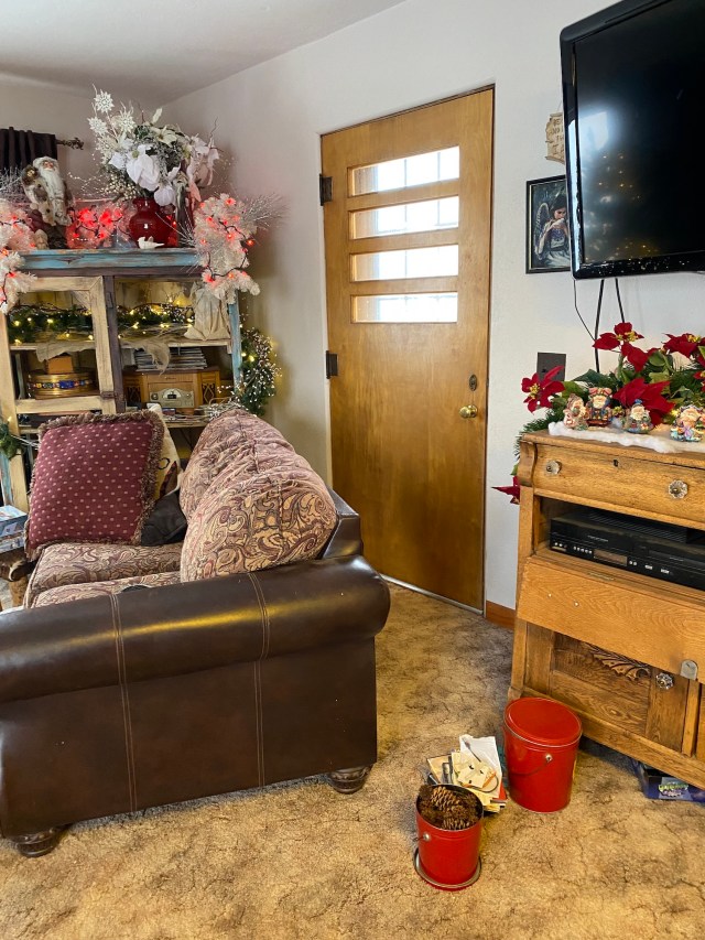 She couldn’t unlock it… so I had to go around to my “front” door. Normally, I wouldn’t think twice about it, but I had shoved my loveseat in front of the door to make way for my tree. I wasn’t sure I could push it with the door as it was wedged between my entertainment cabinet and my big blue shelf.