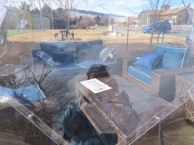 Six clear plexiglass geodesic domes sit on the lawn next to the Visitor’s Center. Today was very warm, 59 degrees, but, being Cody, there was also a brisk wind blowing. These, I supposed would provide a wind proof place to enjoy the sunshine.
