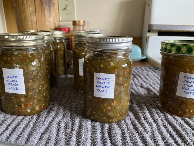 One thing to be said for not having much garden produce… there’s not much to can! My first canning job of the year was sweet pickle relish. Most of the cucumbers were from my sister. I think I am down to one jar from a few years ago, so I’m happy to be restocked.