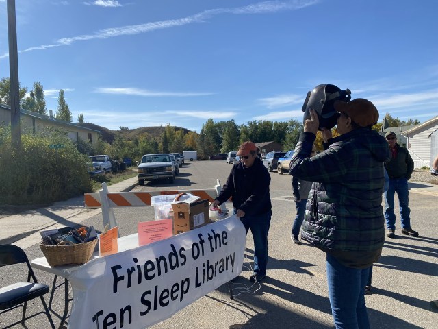 Victoria texted me a photo of her three boys out observing the eclipse this morning. Oh, crumb. I’ve been all in a tizz trying to get things organized to attend HunterFest and the Harvest Dinner. I had spaced it! I was just loading stuff in the car when I decided I should grab a welding helmet and take it with me. I zipped to the shop and met Megan zipping in from her side. We all made a mad dash for the helmets! The view was about at peak but I was already late and the next 20 minutes were spent driving to Ten Sleep instead of watching the eclipse.