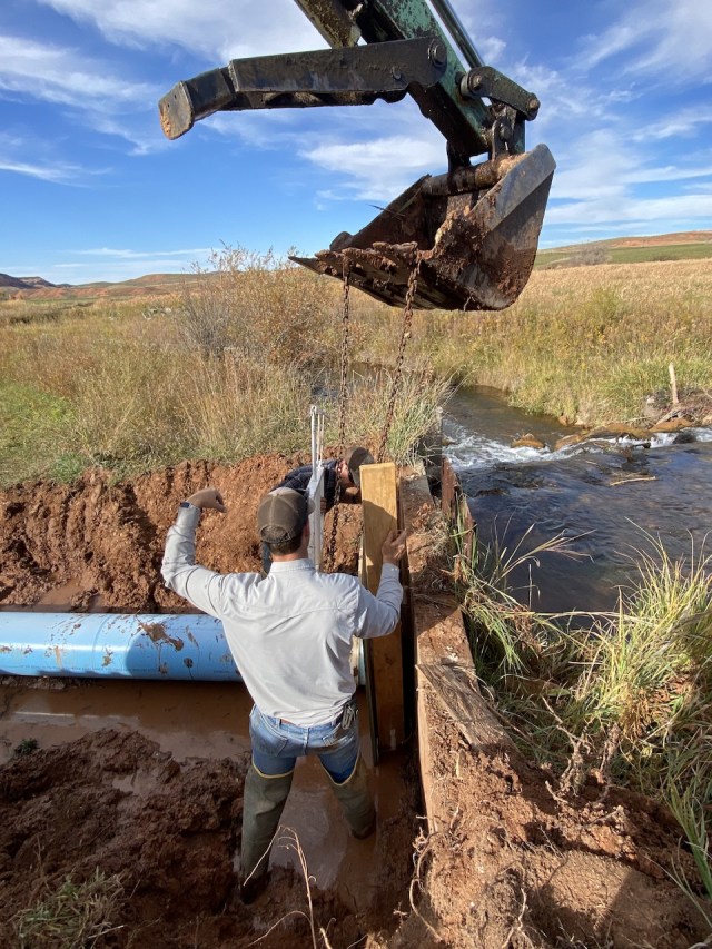 We irrigate mainly by flood irrigation. In short, a temporary dam is built on the creek, backing up water to flow through a head gate which can be adjusted or closed, the water filling a ditch that will flood out onto the field. Brandon’s head gate was old and no longer would completely close, which creates problems, plus the culvert the water ran through was collapsing after working for fifty, sixty, seventy years…