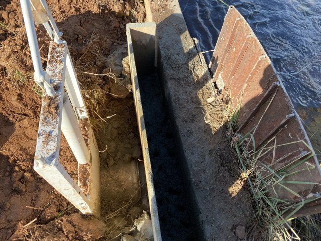 The white thing is the head gate. The old one is left in place as well, it’s the metal piece you see on the creek side. The plywood and 2x6s will be the form to hold the cement to hold it in place.