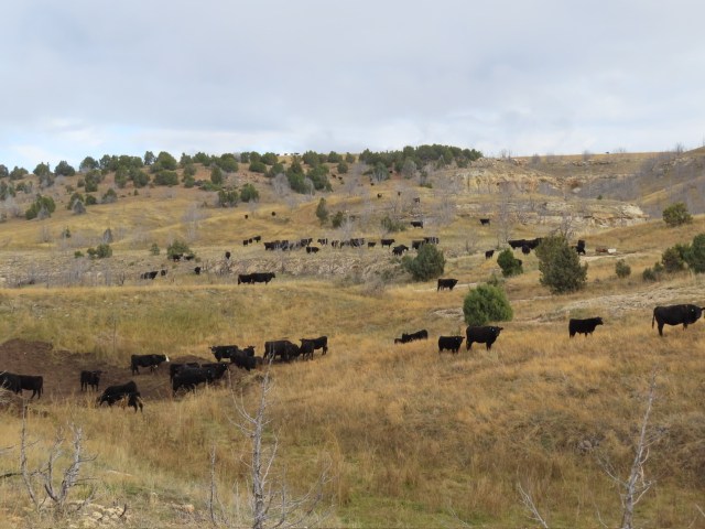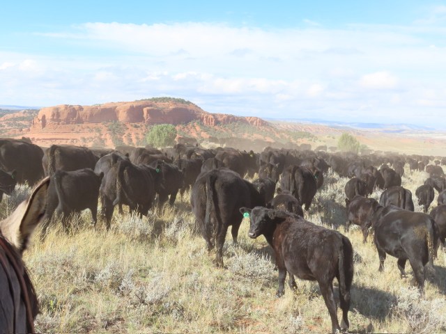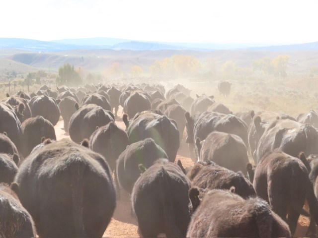 Down and down and around and around. Quinlan was surprised to see the lead strung out half a mile on the county road while the tail end was still high above them. We didn’t take our usual way, so some of the cows were reluctant. It didn’t help that the traffic on those three miles of county road was “busy”. We’d get them hiking along and someone would drive through and they’d remember that wasn’t the direction they wanted to go anyway…