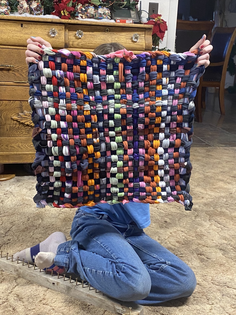 I decided our willow branches were too dry to continue making stars or snowflakes so we moved on. Lorelei has asked before about weaving tshirts, so we investigated to see if I had enough supplies. Sure enough…