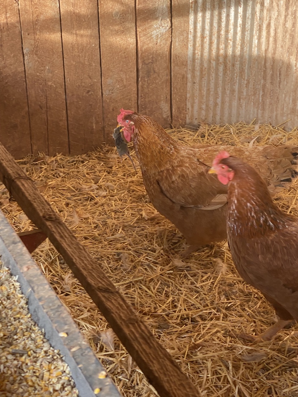 For many people, they envision chickens as sweet little birds. Let me tell you… they are mini velociraptors! One had caught that mouse and every other hen wanted it! A mass melee ran around the coop. I quickly threw out corn and grain, reducing the number of hens after the mouse by half.