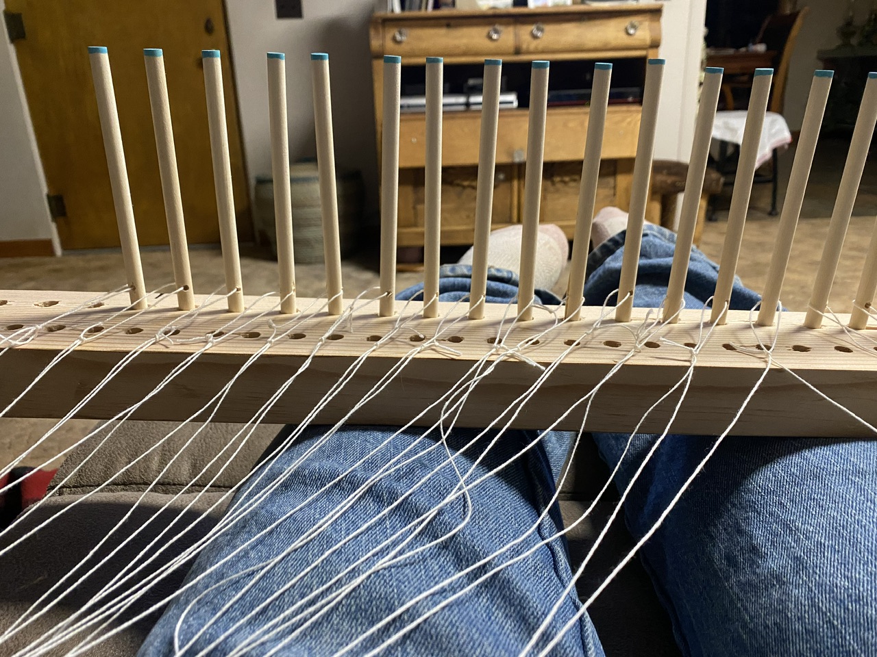 Weft strings are laced into the pegs.