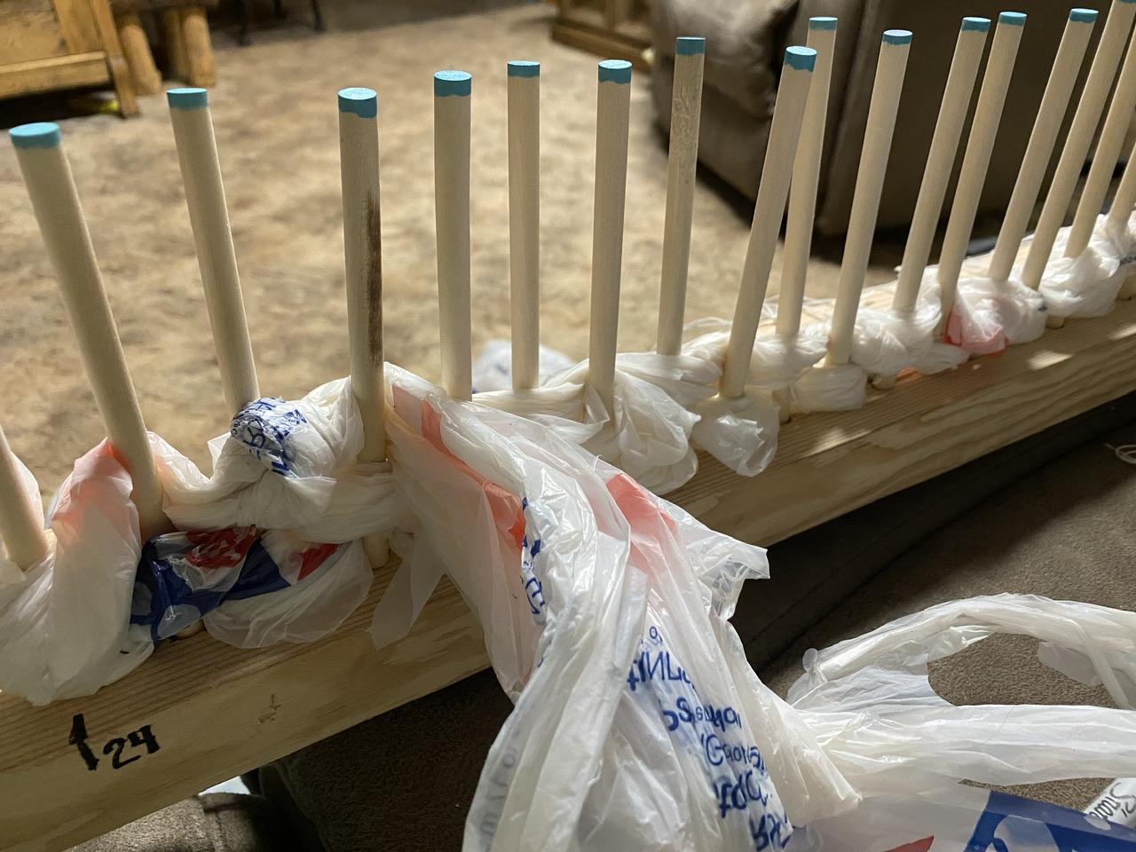 Then whatever you’re wanting your rug to be made from, for my first one, I’m using plastic grocery bags looped into a rope. It is wound alternately around the pegs.
