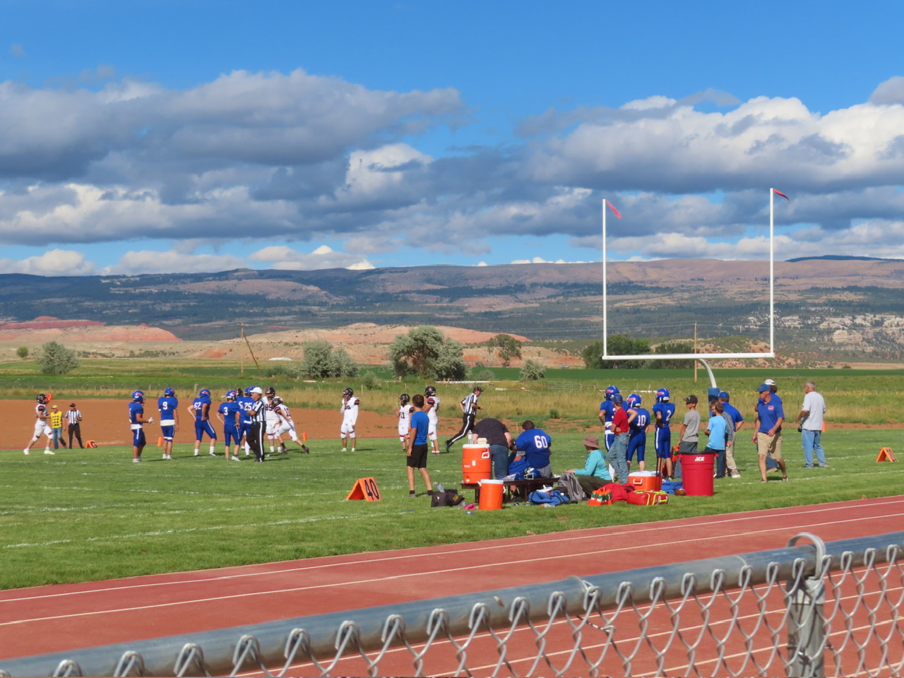 Quinlan and Jaxon got to play on Ten Sleep’s new Kevin Anderson Memorial Field today. Along with our new school, we also got a new football field. The scoreboard finally works, so here we go! Unfortunately, the view from the bleachers is not good. A lot of the game was centerfield. We’re also now separated…