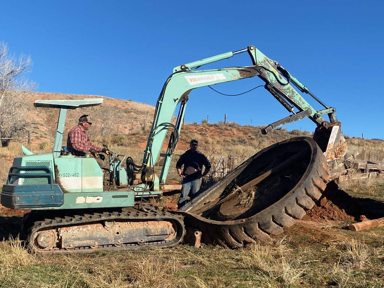 Next on Vernon’s order of business is helping with the big tire water tank In Daniel’s corral. It had been leaking from the fittings underneath. When I arrived, Vernon was in his excavator. He reached out with the big mechanical arm and grabbed the huge tire and started to drag it to its new location….
