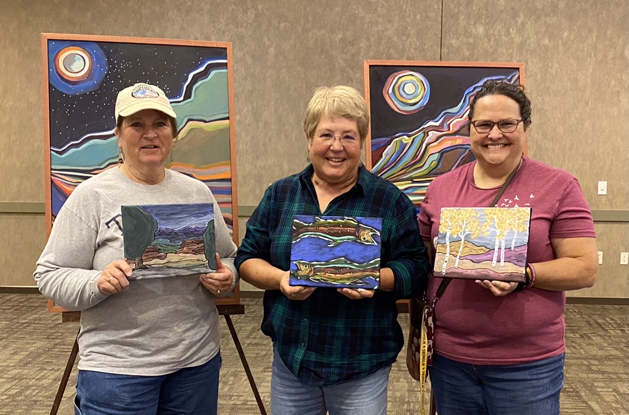 I know, I just returned from days in Casper and here I am, enjoying another workshop with friends. Sponsored by the Washakie Museum, this one was with artist, Noelle Weimann. For this class, we used black canvas, blocked out areas of our canvas, and filled in our landscapes with color. Of course, I painted my…